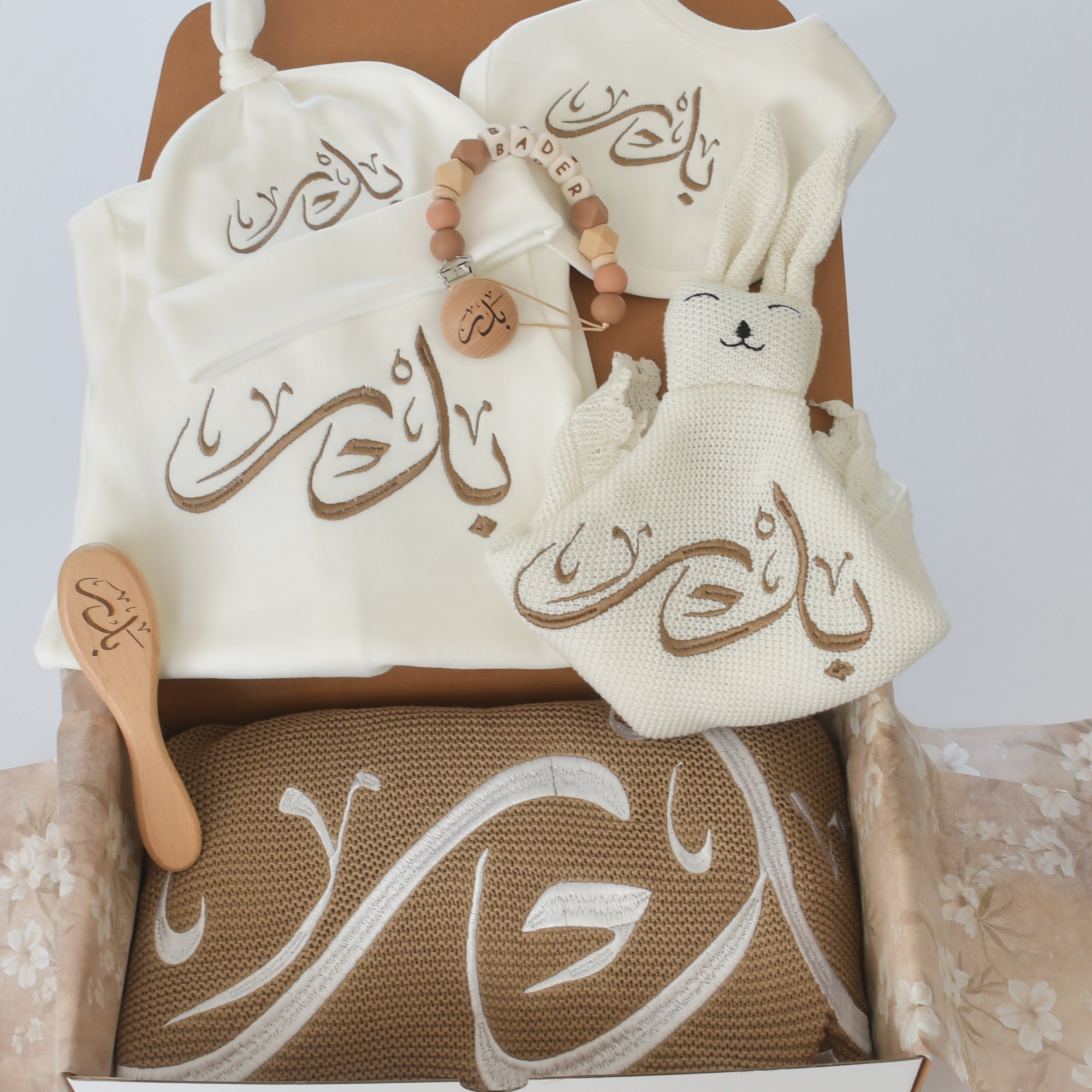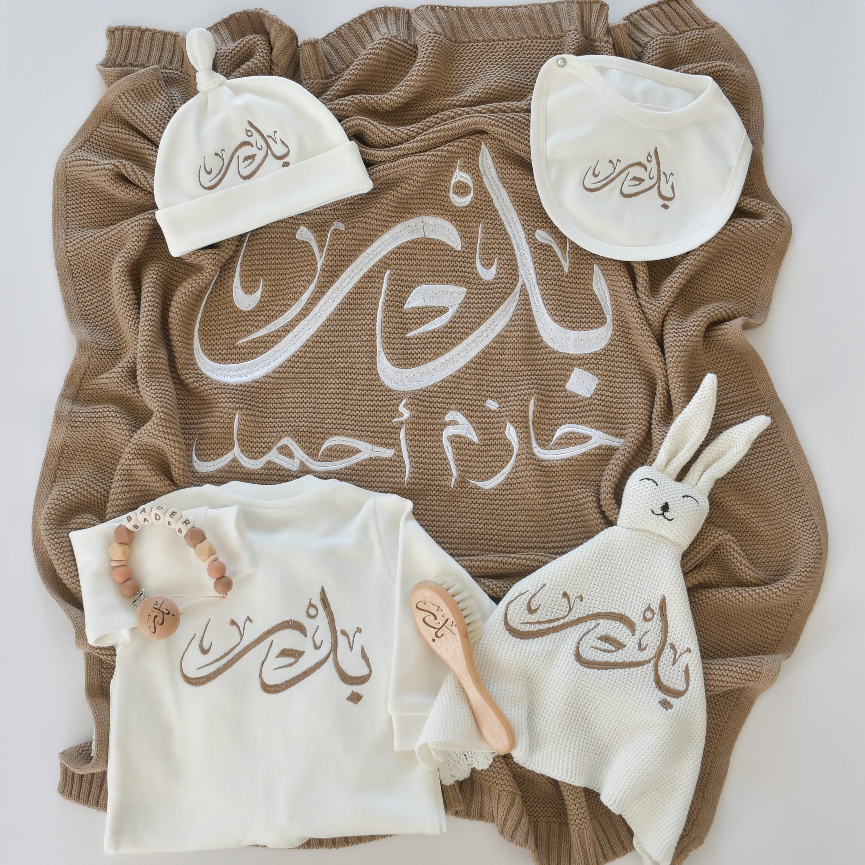 Customizable: Embroidered with the baby's name for a personal touch. Please mention baby name in English/Arabic in the note box and select font style.