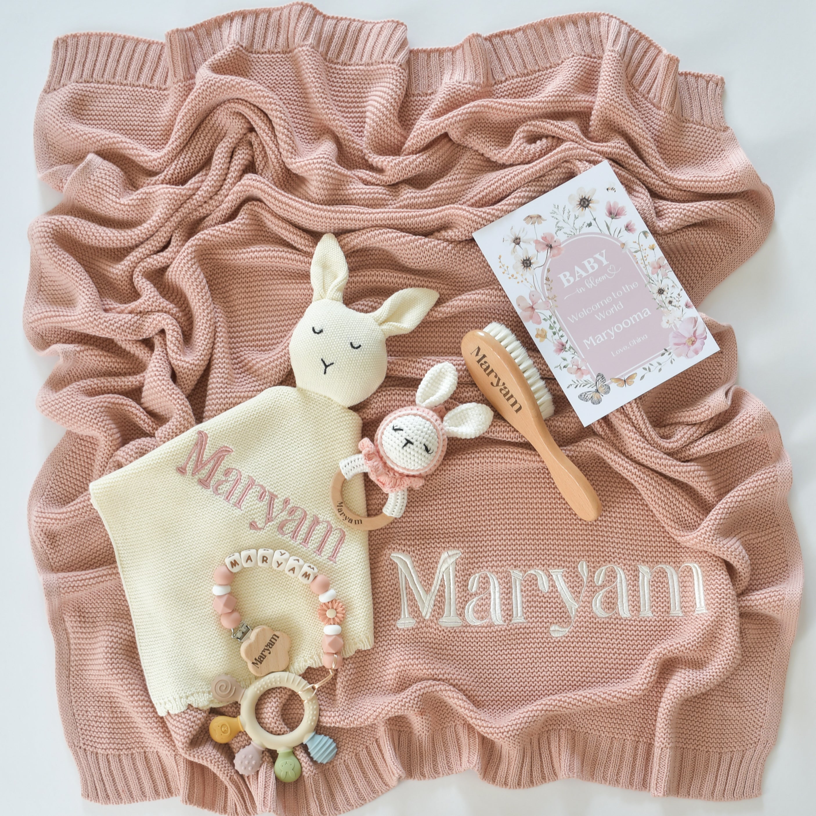 This set consists: Baby blanket :100% Knit Cotton: Size: 100X80 cm Security blanket (Bunny): 100% Cotton. Size: 36X36 cm Crochet bunny rattle toy Wooden brush with name engraved Silicon teether Pacifier...