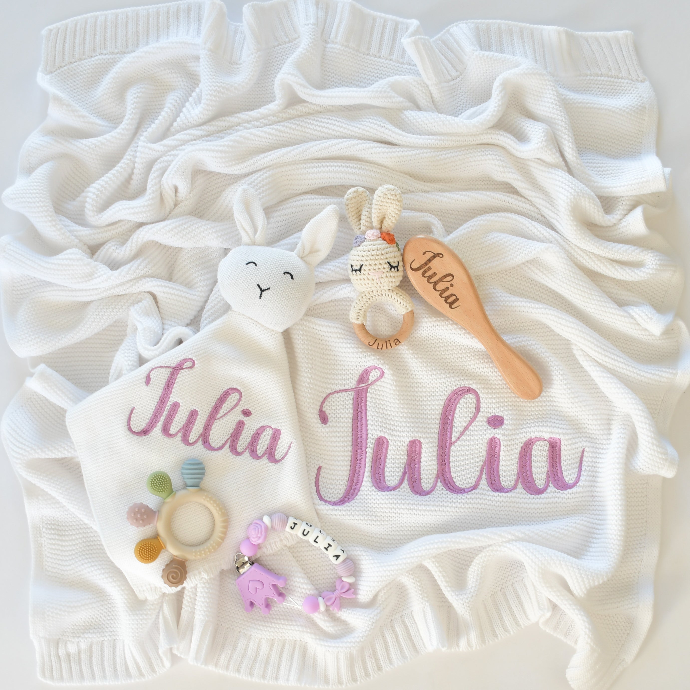 This set consists: Baby blanket :100% Knit Cotton: Size: 100X80 cm Security blanket (Bunny): 100% Cotton. Size: 36X36 cm Wooden hair brush (with baby name engraved) Bunny teether (with baby name...