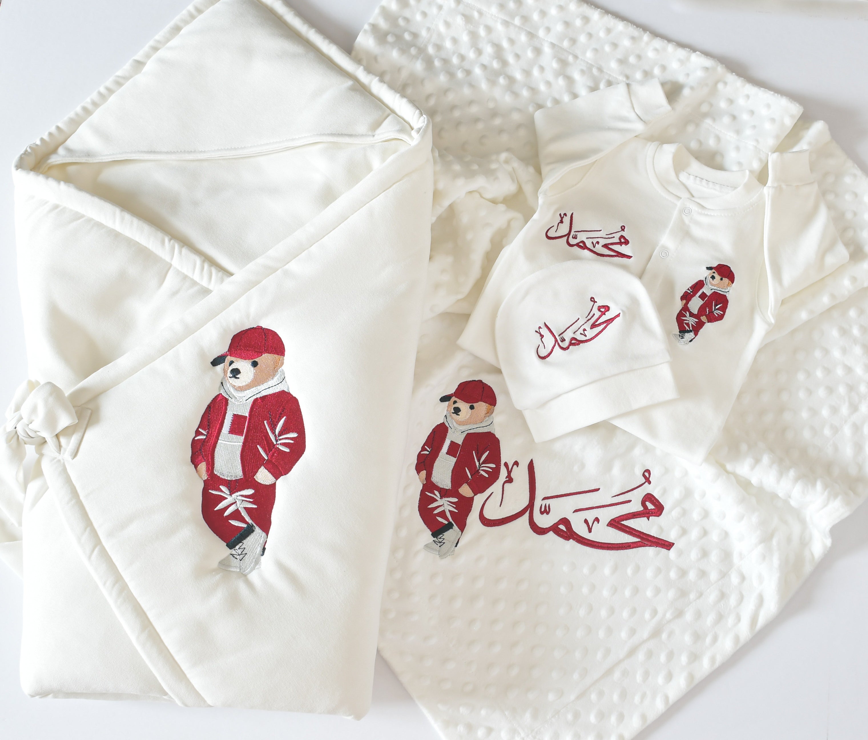 This set is available sizes Newborn, 0-3, 3-6 and 9-9 months. Please mentione baby name in the name field (in Arabc or English).