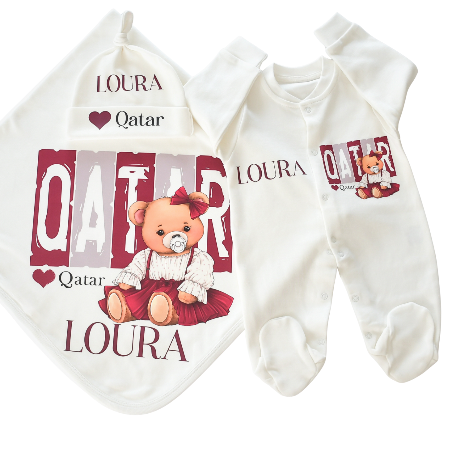 This set is available sizes Newborn, 0-3, 3-6 and 6-9 months. Please mentione baby name in the name field (in Arabc or English). Delivery same day