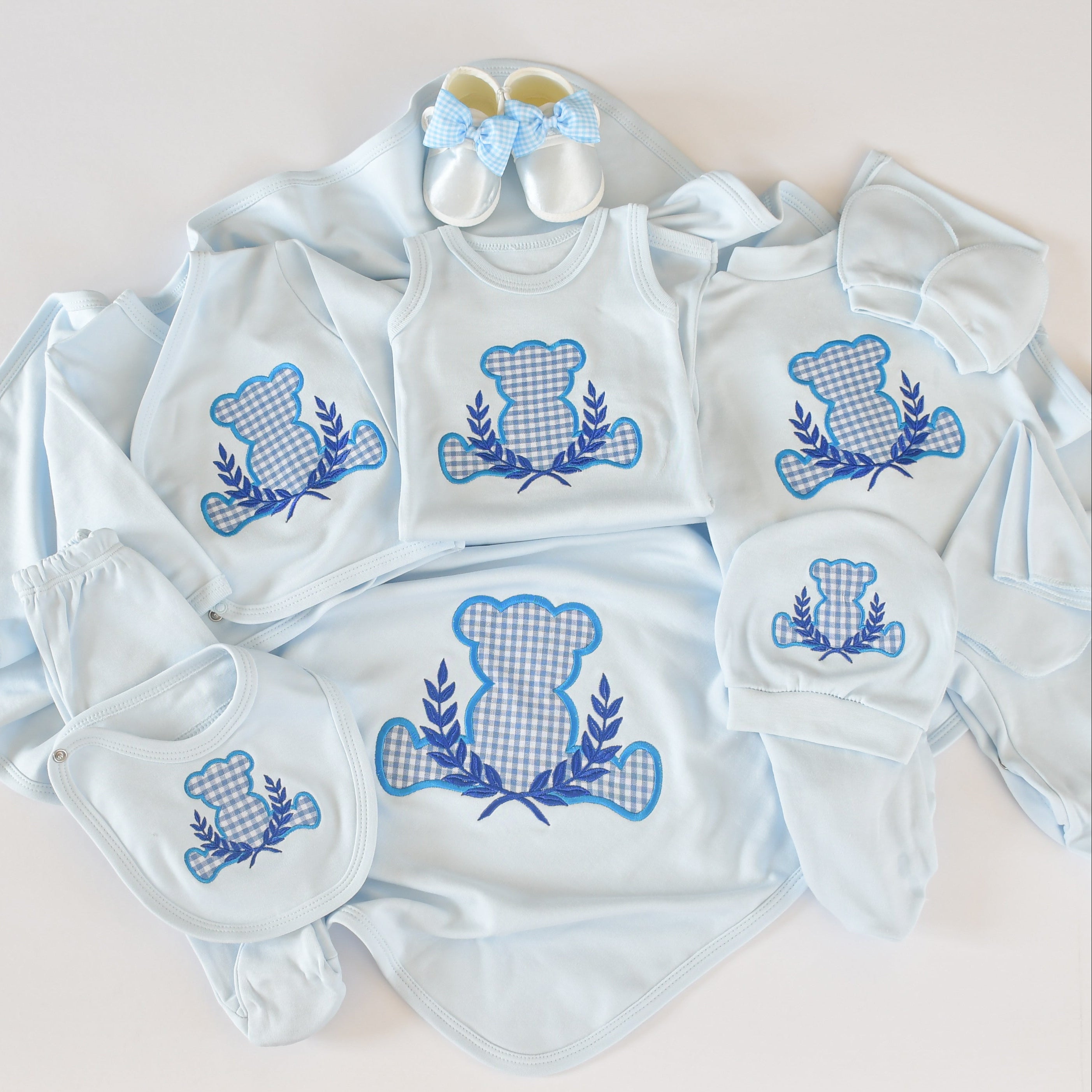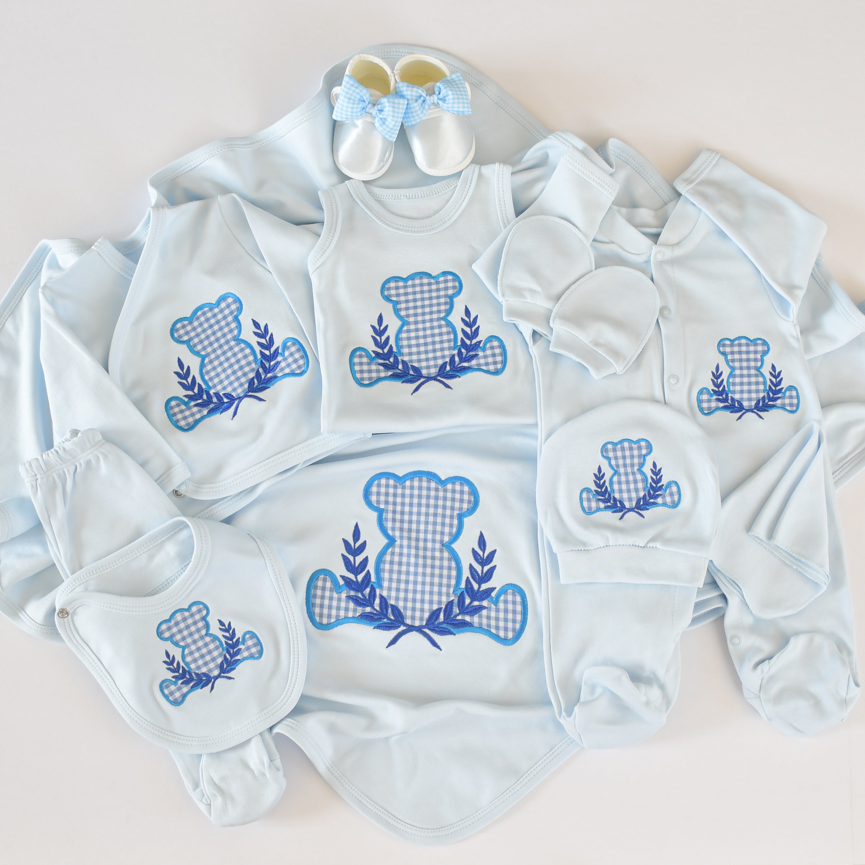 10 pieces Newborn baby boy set from our new  baby collection. This set is made from quality soft cotton and embroidered with teddy design.