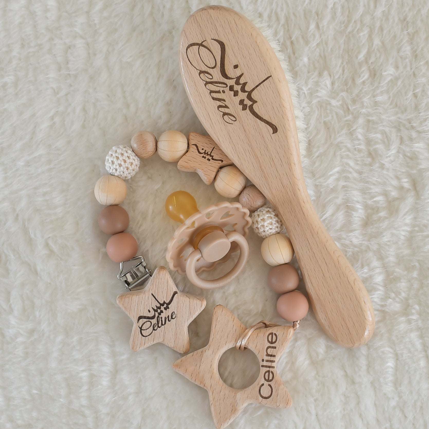 This gift box consists of: Pacifier Clip with baby name, wooden baby brush with baby name engraved on the back side, and star wooden teething toy. You can add pacifier to this gift box. This set comes wrapped in a gift box.