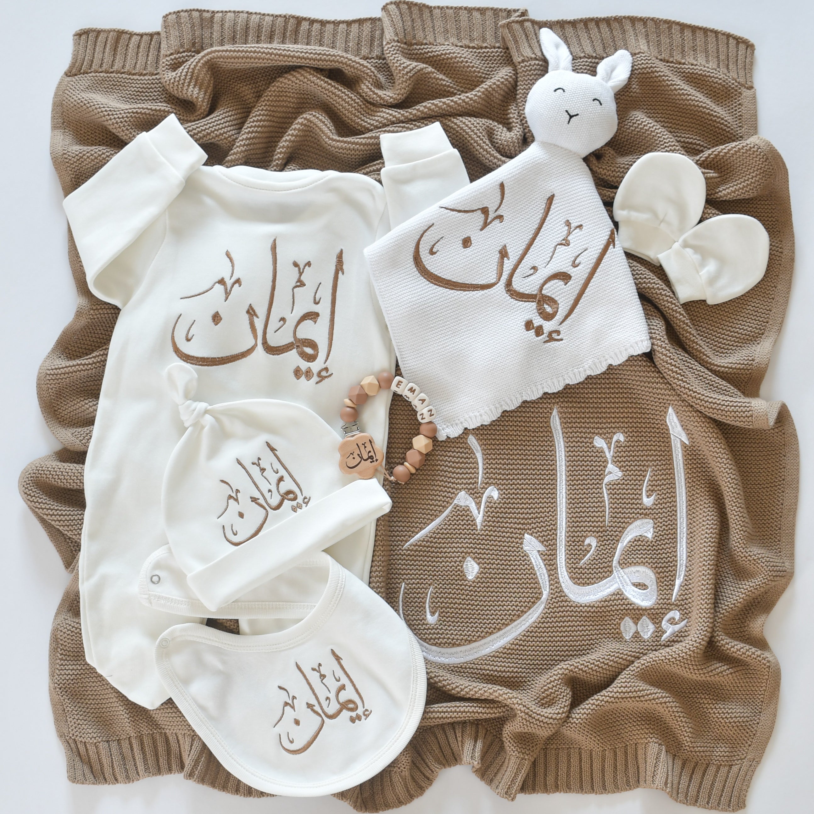 Customizable: Embroidered with the baby's name for a personal touch. Please mention baby name in English/Arabic in the note box and select font style.