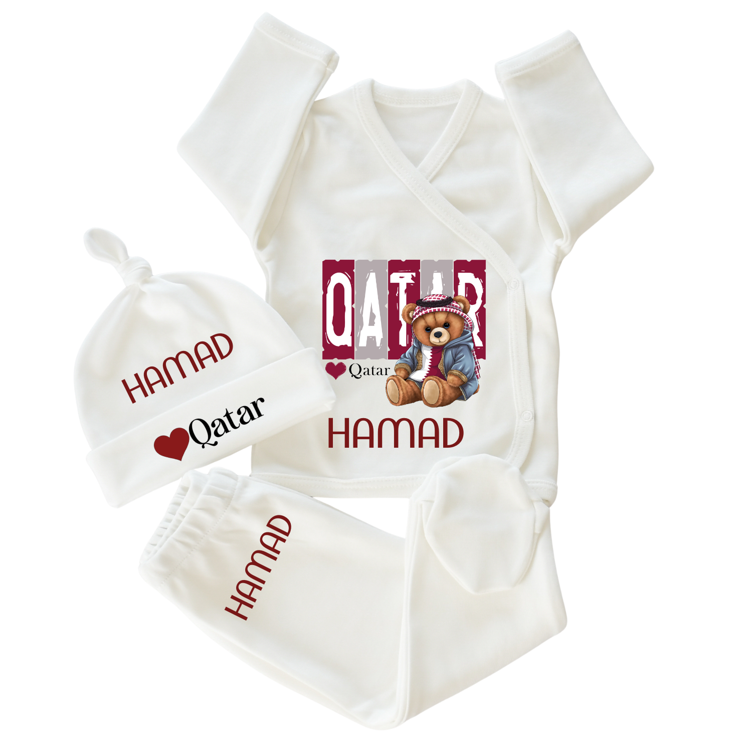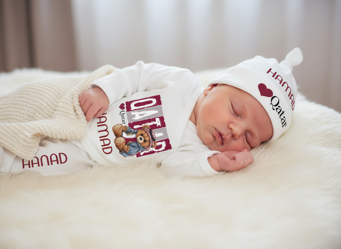 This set is available sizes Newborn, 0-3, 3-6 and 9-9 months. Please mentione baby name in the name field (in Arabc or English). Delivery same day